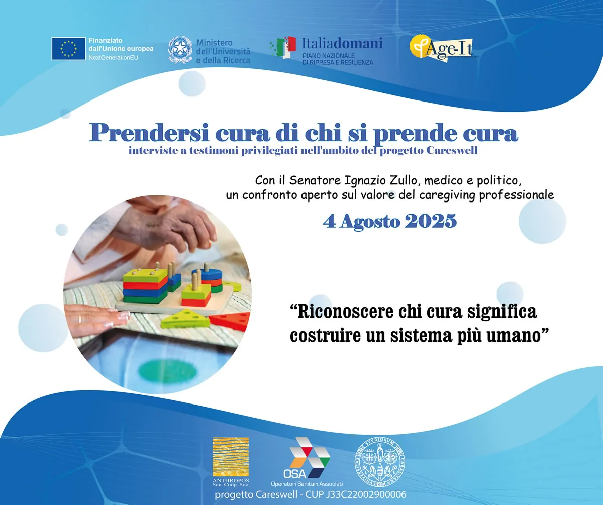Insieme al Senatore Zullo abbiamo affrontato i temi oggetto dell'indagine prevista nel progetto Careswell. Circa lo stato attuale del sistema di caregiving il senatore lo definisce avanzato ma non compiuto. Ci sono molte cose da fare per accrescere il benessere delle lavoratrici e dei lavoratori ch erogano servizi di assistenza e cura formalizzata sia a livello domiciliare che presso strutture.