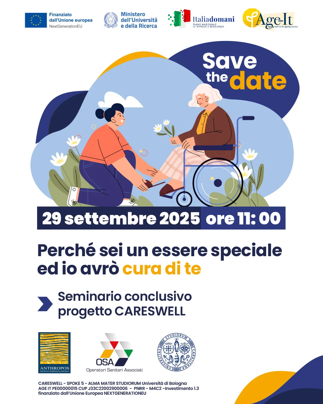 È in programma il 29 settembre alle 11 il seminario conclusivo del progetto #CARESWELL, l'indagine nazionale sul lavoro di cura promossa, nell'ambito di Age-it, da Anthropos Società Cooperativa Sociale e da OSA - Operatori Sanitari Associati in collaborazione con UniCa - Università degli Studi di Cagliari.